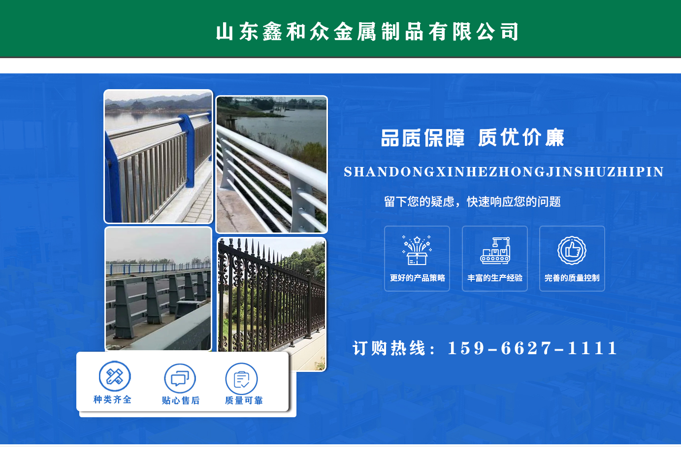 山東鑫和眾金屬制品有限公司主要產(chǎn)品有防撞護(hù)欄,橋梁護(hù)欄,道路護(hù)欄,河道護(hù)欄,不銹鋼護(hù)欄等護(hù)欄。提供設(shè)計(jì)方案,一站式定制,包您滿意價(jià)格優(yōu)惠,歡迎來電咨詢! 公司常年從事銷售護(hù)欄防撞護(hù)欄,橋梁護(hù)欄,道路護(hù)欄,河道護(hù)欄,不銹鋼護(hù)欄,橋梁鋼護(hù)欄,河道燈光護(hù)欄等。產(chǎn)品廣泛應(yīng)用于橋梁、河道、旅游景區(qū)、道路、公路、公園、小區(qū)、景觀、道路防撞等領(lǐng)域?! 」井a(chǎn)品均采用優(yōu)質(zhì)不銹鋼材料,符合相關(guān)標(biāo)準(zhǔn)。各種型號(hào)不銹鋼復(fù)合管及護(hù)欄,質(zhì)量嚴(yán)格把控。產(chǎn)品強(qiáng)度高、耐腐蝕、焊接牢固、抗沖擊、性能好,防撞護(hù)欄結(jié)構(gòu)簡(jiǎn)單、美觀實(shí)用大方?! g迎前來訂購(gòu)!...